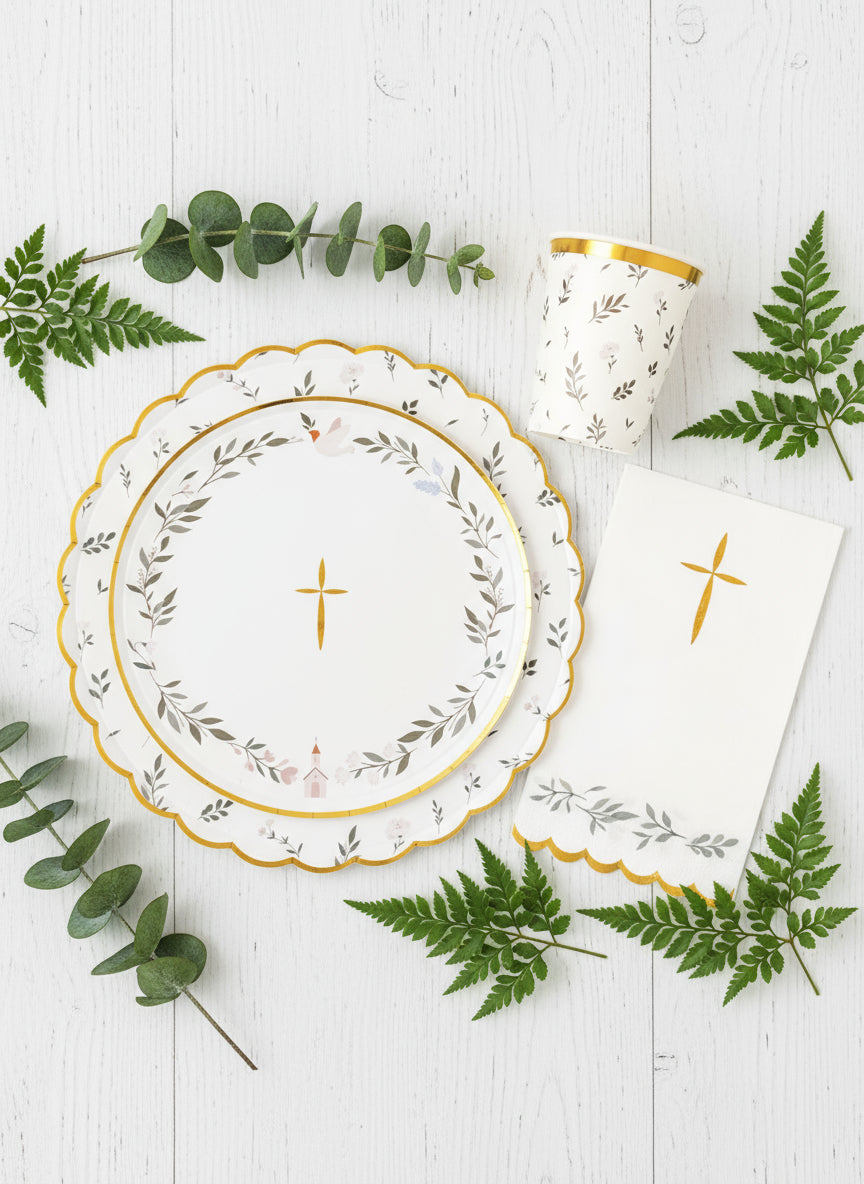 Soft pastels, a peaceful white dove, olive wreath, and gold cross come together in a beautifully minimalist design, finished with a delicate gold-foil rim. A tiny church illustration adds a heartfelt touch — perfect for Baptisms, First Communions, Confirmations, Weddings, and other faith-filled celebrations.