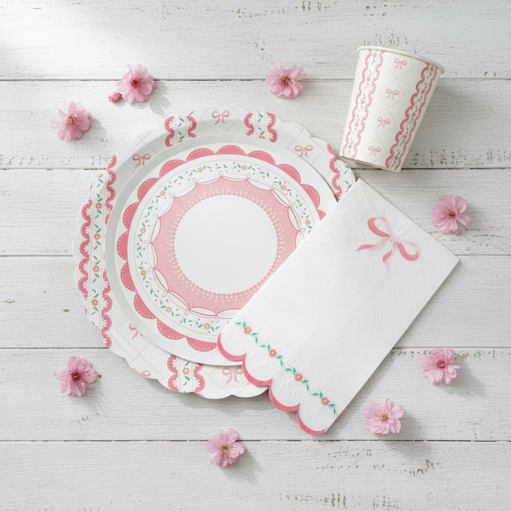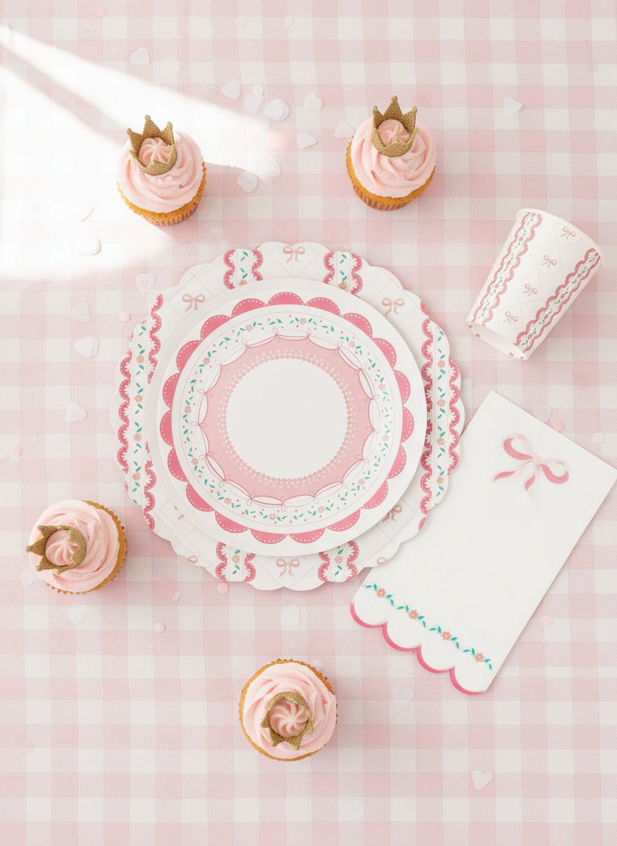 These Pink Bow Paper Plates feature a whimsical pattern of delicate bows, dainty flowers, and scalloped edges in soft pastel pink tones. Perfect for tea parties, girly birthdays, bridal showers, or baby showers, they add a stylish, feminine touch to your tablescape.